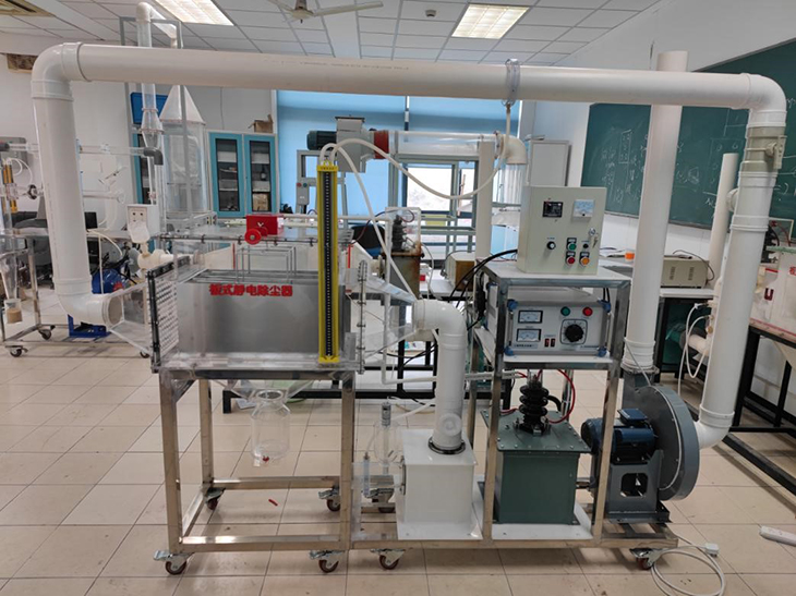離心風(fēng)機(jī)、旋風(fēng)分離器、袋式除塵器、靜電除塵器、高壓靜電發(fā)生器、機(jī)械振打裝置、風(fēng)量調(diào)節(jié)閥、發(fā)塵箱、集塵裝置、管路、U型壓力計(jì)、畢托管流量計(jì)、振動(dòng)電機(jī)、電路控制柜、不銹鋼框架