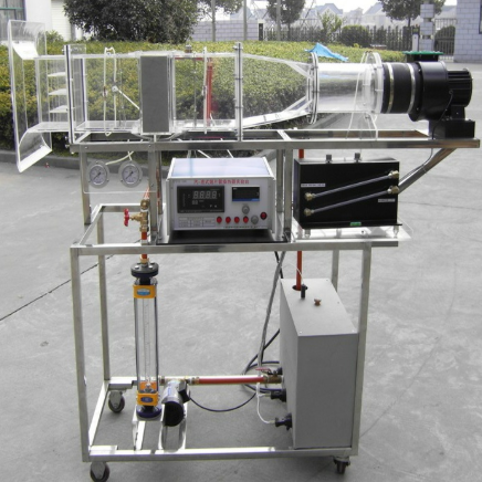 循環(huán)防腐水泵,轉子流量計,翅片管式換熱器,風洞實驗段,離心式風機,自動調節(jié)風門,笛形管及差壓測風速裝置,加熱由固體調壓模塊無級調節(jié),控制測試儀表箱,不銹鋼加熱水箱,巡檢儀顯示溫度、水和風的阻力及風速,不銹鋼臺架及控制屏。