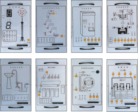 演示裝置上對PLC的輸入輸出均采用24V電源,5V電源供執(zhí)行機構中的外圍使用,每套演示裝置主要由十七塊實驗掛箱組成,它們的型號分別為: