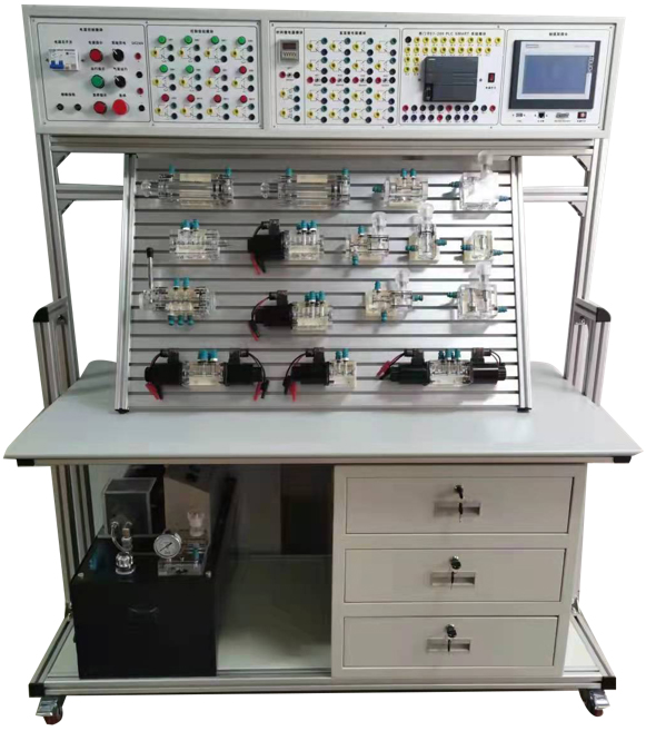 (3)配有控制模塊:電源模塊,PLC控制模塊,繼電器控制模塊,時間繼電器控制模塊、控制按鈕模塊,液壓元件獨立模塊等。