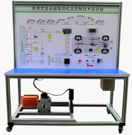 檢測控制面板(裝有各種檢測端子,1448×940mm彩色電路圖和工作原理示意圖)、組合儀表、點火開關、電機控制器、車載充電器與充電接口、DC-DC轉換器、鋰動力電池組、電動車電機(永磁同步電機)、剎車開關、檔位開關、油門控制裝置、大電流繼電器、電源總開關、急停開關、輔助蓄電池(12V45AH)、一體化全鋁合金型材搭建的移動臺架(1500×700×1700mm (帶自鎖腳輪裝置,帶安裝檢測端子的原理面板,面板1448×940mm)、設備操作說明書。