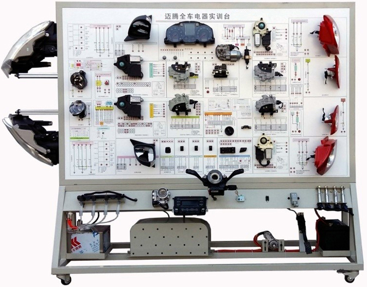 該設(shè)備采用全新邁騰B8L 2021款車身電器實物為基礎(chǔ),充分展示汽車儀表系統(tǒng)、燈光系統(tǒng)、雨刮系統(tǒng)、喇叭系統(tǒng)、電動車窗系統(tǒng)、電動門鎖、音響系統(tǒng)、起動系統(tǒng)和充電系統(tǒng)等汽車電器各系統(tǒng)的組成結(jié)構(gòu)和工作過程。