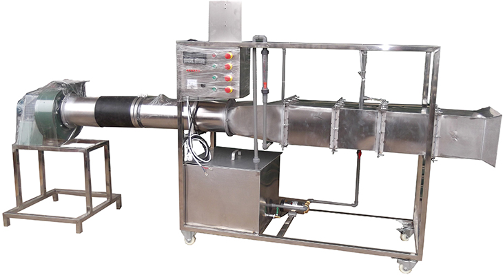 循環(huán)防腐水泵,轉(zhuǎn)子流量計(jì)、風(fēng)冷冷凝器,翅片管式換熱器,風(fēng)洞實(shí)驗(yàn)段,多翼式低噪音離心風(fēng)機(jī),自動(dòng)調(diào)節(jié)風(fēng)門,笛形管及差壓測風(fēng)速裝置,加熱由固體調(diào)壓模塊無級調(diào)節(jié),控制測試儀表箱,不銹鋼加熱水箱,8路萬能信號(hào)輸入巡檢儀顯示溫度、水和風(fēng)的阻力及風(fēng)速。