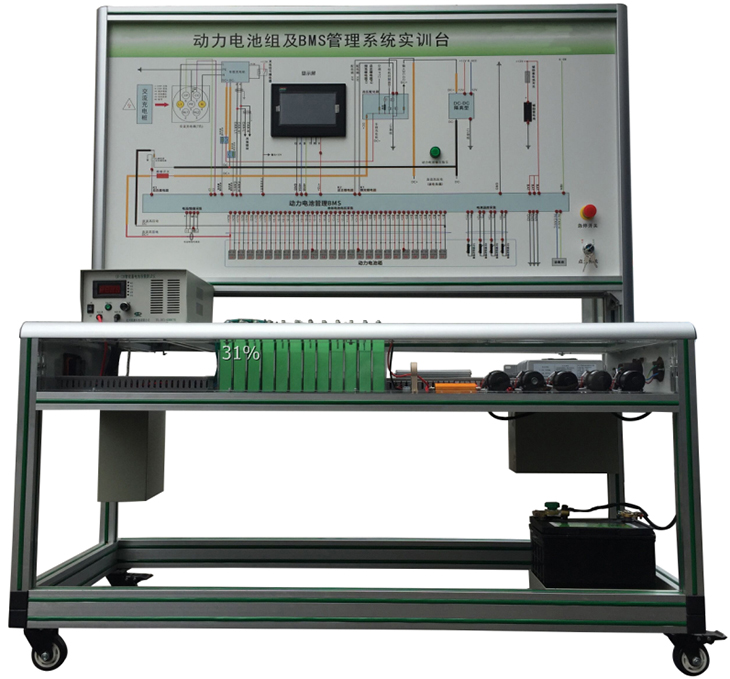 磷酸鐵鋰動力電池包與鐵制電池箱(單體電池3.2V 20AH,24串)、BMS鋰電管理一體機、動力電池包觸摸顯示屏、車載充電機、國標充電插口、國標充電槍、緊急斷電開關(guān)、霍爾電流傳感器、直流接觸器(包含充電繼電器、總正繼電器、總負繼電器、預(yù)充繼電器)、DC-DC轉(zhuǎn)換器(72V-12V30A)、輔助蓄電池(12V45AH)、放電控制繼電器與放電負載電阻、預(yù)充電阻器、可移動實訓臺(1500×700×1700mm 帶自鎖腳輪裝置,帶安裝檢測端子的原理面板,面板1448×940mm)、故障模擬與排除裝置、設(shè)備操作說明書。